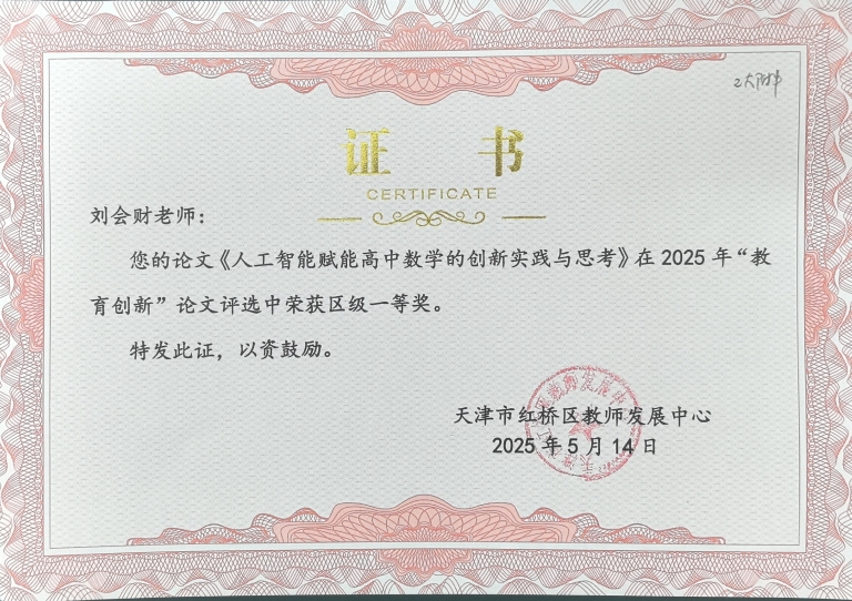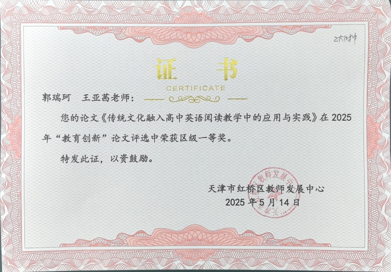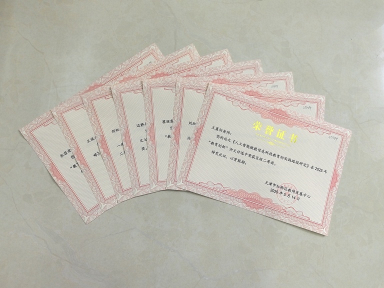 本学年,在天津市基础教育2025年“教育创新”论文评选中,2位教师(郭瑞珂、刘会财)荣获区级一等奖,7位教师(王晨阳、刘欣、蔡丽霞、边静、刘钰、王瑞、宋菲)荣获区级二等奖,13位教师(周晓芸、刘媛媛、穆赤喜、彭志伟、吴枫、董玲、冯博、张铭、董祥、史萌凯、张子筱、朱彤、李莉)荣获区级三等奖,在此向他们表示衷心的祝贺。