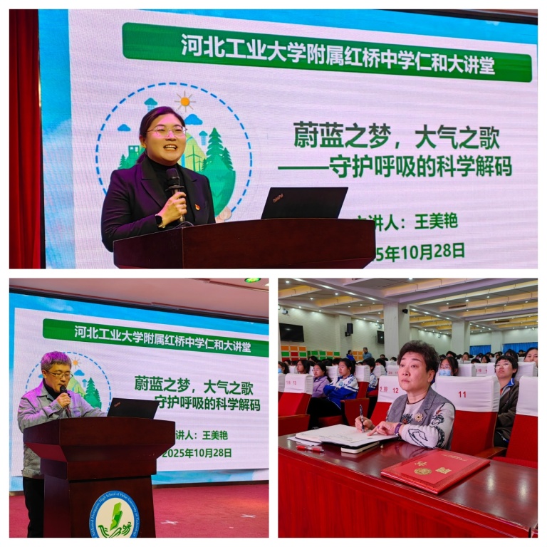 2025年10月28日,河北工业大学附属红桥中学品牌系列活动“仁和大讲堂”第五十六期在校园内隆重举行。本期讲座特邀河北工业大学能源与环境工程学院王美艳副教授莅临主讲,为我校师生带来了一场题为《蔚蓝之梦,大气之歌:守护呼吸的科学解码》的精彩专题讲座。我校党委书记孙鸿毅同志、副校长柳燕同志携相关中层干部及教师,与高一年级全体同学一同参加了本次活动。活动由高一年级主任万凯主持。