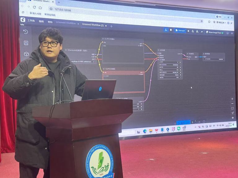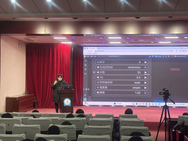 讲座中郭老师介绍了AI生成的各种工具,并对专业级AI创作工具ComfyUI进行了现场演示。从ComfyUI的节点式操作,到AI背后复杂的算法逻辑,引导学生们认识到,未来的艺术将不再仅仅是感性表达的产物,更是理性思维与技术的应用。对于在座的美术班学生而言,在未来的学习中更要重视文化课,尤其是数理化的学习。