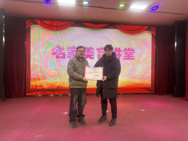 教务处副主任李啸玄感谢郭老师精彩的讲座,并颁发聘书。鼓励同学们在未来学习和艺术探索的道路上不断前行,勇敢尝试将科技与艺术相结合,创造出属于自己的独特作品。